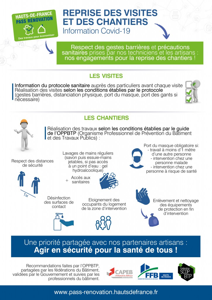 Pour permettre de reprendre les visites et l’accompagnement auprès des particuliers, Hauts-de-France Pass Rénovation et Pass Copropriété ont adopté une nouvelle organisation permettant d’appliquer les gestes barrières et mesures sanitaires pour assurer la sécurité de tous.